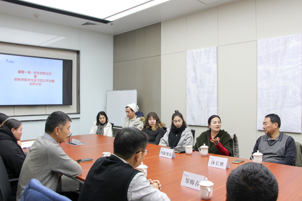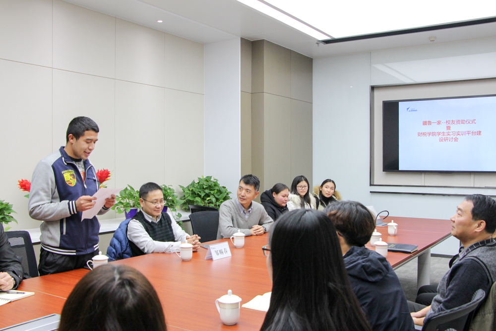 财税学院党委副书记汤长胜首先对邹赐春先生的义行善举和社会责任感给予高度评价。他期望受助学生正确对待暂时困难,把贫困当作磨炼成长的阶梯,把关爱化作砥砺前行的动力。随后,他谈到在大学里的学习要做到校内外结合,实习实训平台的目的是让同学们拓宽视野,选择适合自己的领域和道路。与会双方就财税学院学生实习实训平台建设进行了研讨。
