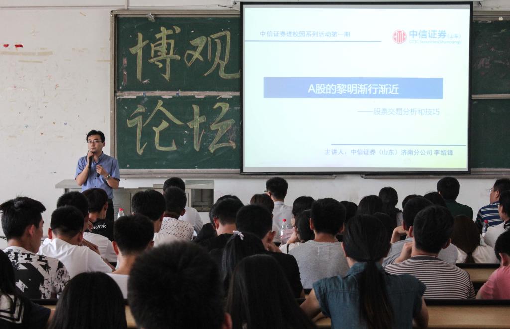 讲座伊始,李绍峰以“A股的黎明渐行渐远”为主题,从宏观经济面分析、基本面选股技巧、技术分析介绍、中信证券特色服务各个方面介绍了股票交易的分析和技巧,帮助学生们树立了正确的理财观念。最后,他向在座学生推荐阅读的书籍,希望学生能够把握大学生活,多读书丰富自己的见识,为以后进一步考研和就业做好准备。高飞则着重介绍了证券行业的主要职责,并指出中信证券与高校合作为学生提供实习岗位。