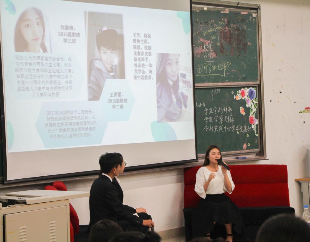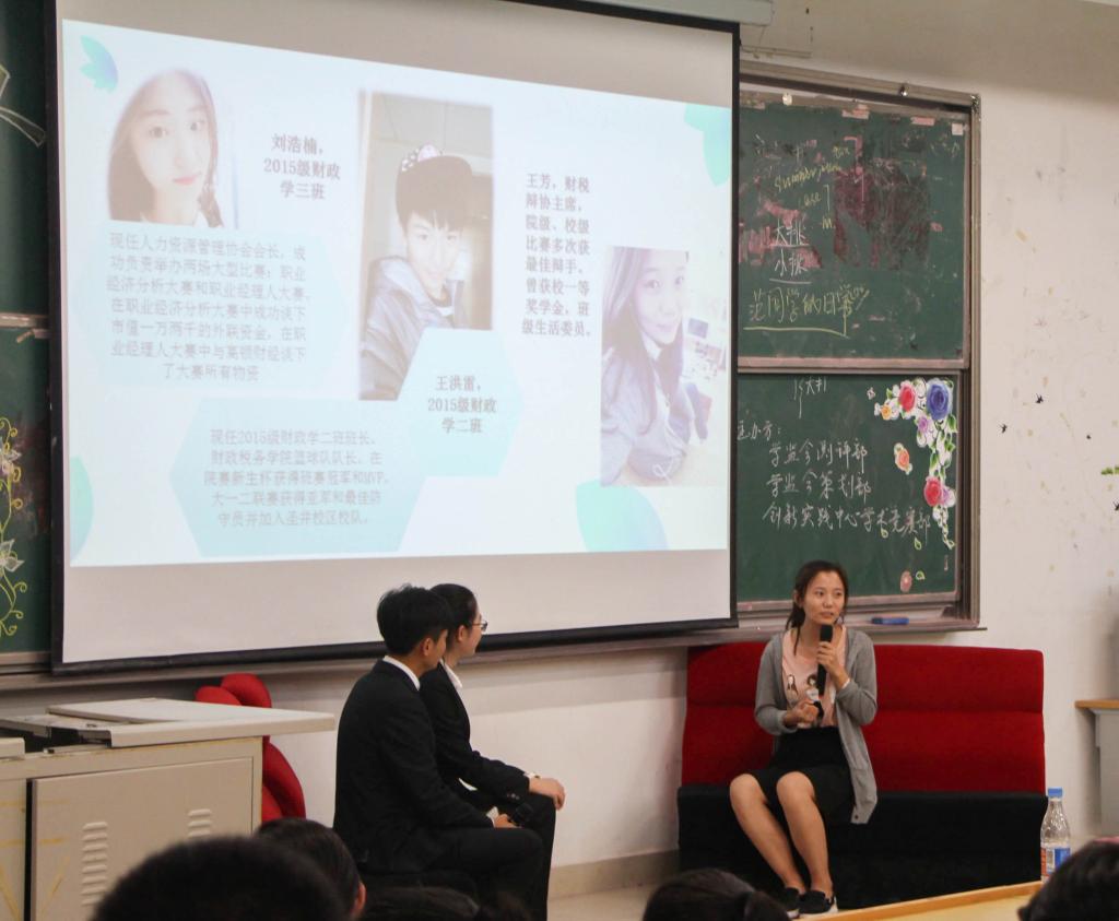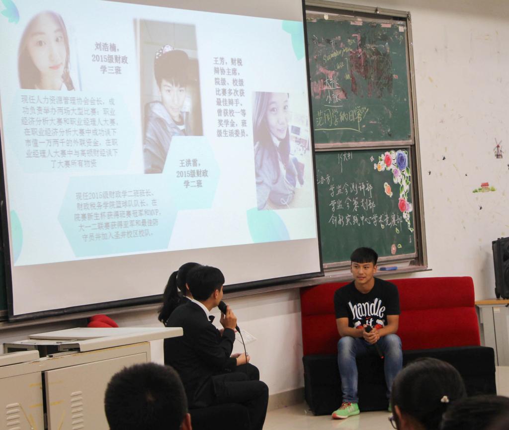 访谈以各位主讲人的亲友团采访视频开场,以访谈形式向新生传达经验。张泽祯,有论文刊载于《南方经济》,曾获国家励志奖学金等多项荣誉并于2016年暑期在普华永道实习,凭借丰富的实习经历向2016级新生介绍了在大学四年所应培养的能力以应对找工作的需求。他强调了要多方面发展自己,在玩中学,做自己想做的事情。范佳慧,中共党员,樱桃影视
