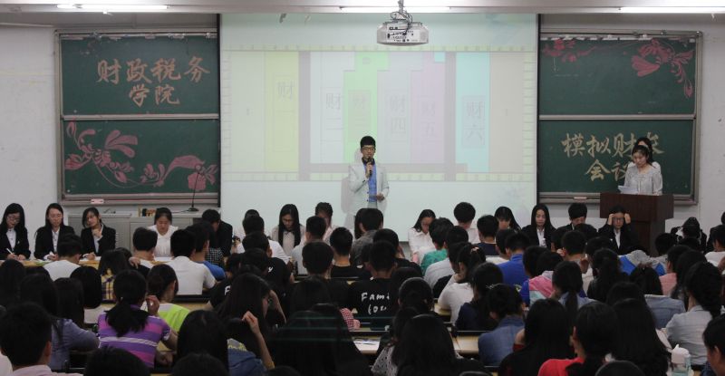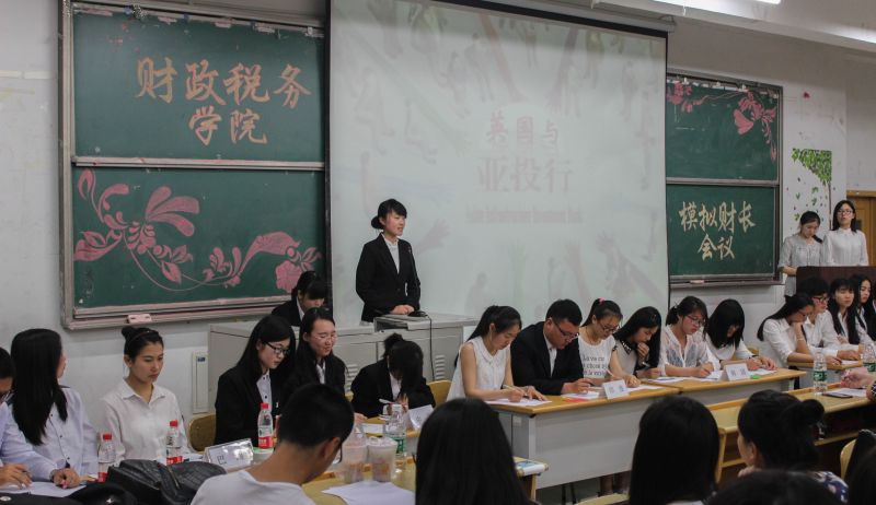“模拟财长会议”活动在圣井校区敏行楼圆满结束。本次大会由创新实践中心社会实践部主办。出席此次活动的老师是学院团委书记王正一老师,参加此次活动的有财税学院学生会圣井分会常委团,创实中心副主任李君爽及创实中心社会实践部部长李晓宇。2014级财政学一班至六班推选出的8个国家代表队、税收学一至六班与财政学七班推选出的相同的8个国家代表队分别参加了两天晚上的比赛。2014级同学观看了此次活动。