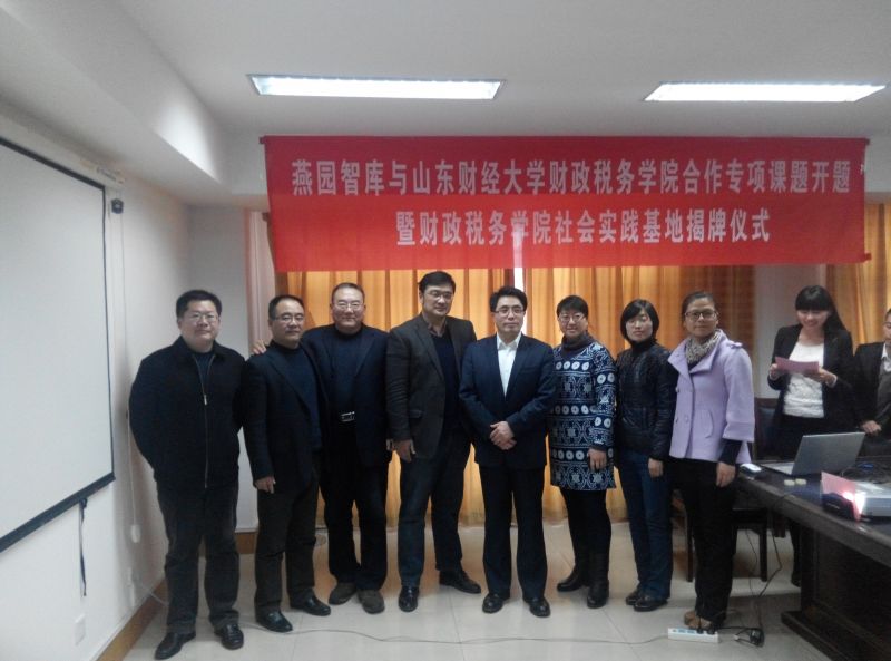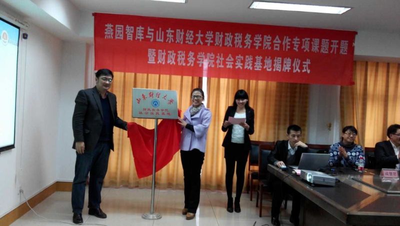 会议室举行。出席仪式的燕园智库代表有:北京大学民营经济研究院研究部副主任、燕园智库执行秘书长、燕园财税学术委员会副主任张维智,燕园财税导师团团长成慧君,燕园导师李复新、张晓君,燕园财税山东分公司负责人侯柯。财税学院副院长李森、副书记汤长胜、财税实验教学中心主任神方立、财税团总支李建永老师出席仪式。