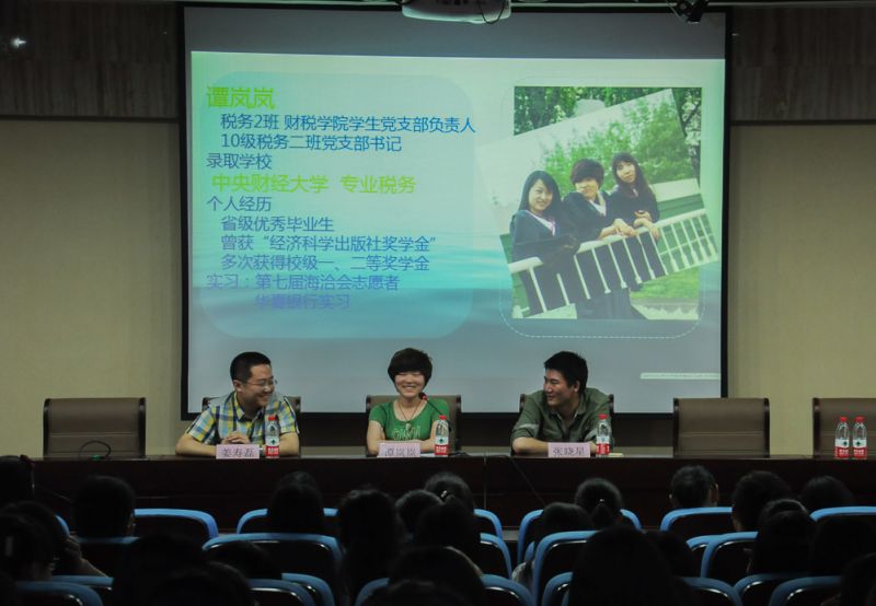 学工办主任兼团总支书记王正一老师。经验交流会的主讲人是在2013年研究生、国家公务员中考试中取得优异成绩的2010级学生谭岚岚、张超、姜寿磊、张晓星、张书经。本次交流会由财税学院团总支主办,院学生会学习部承办。山财大部分学生聆听了交流会。