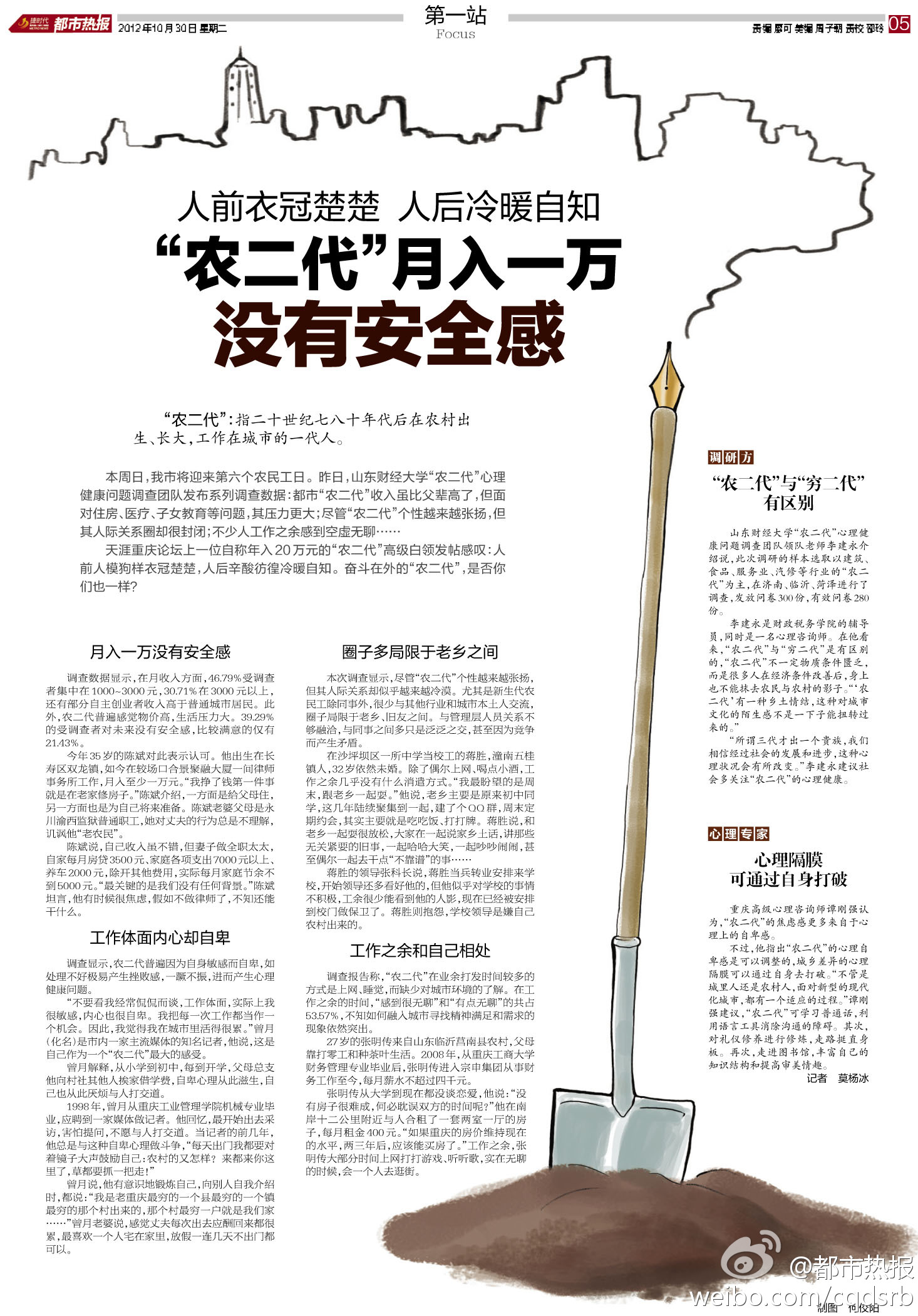 随着经济社会发展,“农二代”(第二代农民工的简称)的心理健康问题近年来越来越成为当今社会关注的焦点。继富士康N连跳之后,浙江省台州市一个街心花园内,三名20岁上下的少年相约服毒,酿成两人死亡的悲局。发人深思的是,类似的悲剧频繁发生,而这些自杀者均不足25岁。为何悲剧在他们自己身上一再发生?“农二代”作为一个新生的社会群体,他们的各种心理问题早已露出端倪,只是没有能够引起社会各界人士的重视和深入的研讨。