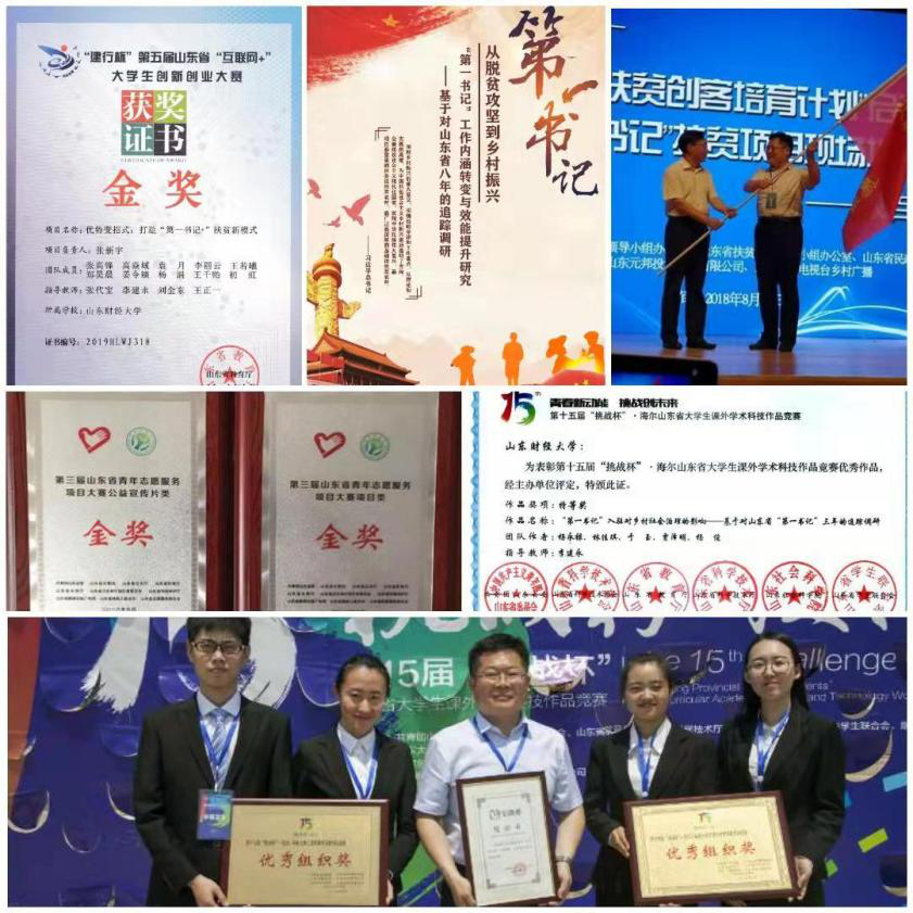 团队积极推动深度追踪调研成果的转化,转化为高质量作品参加“挑战杯”、“互联网+”、“国家级大学生创新创业计划”等创新创业竞赛,多次获得国家级、省级荣誉。第一书记项目除了参加“挑战杯”全国大学生课外学术科技作品竞赛获奖之外,近年来还获得过第五届山东省互联网+大学生创新创业大赛金奖、国家级大学生创新创业计划、第三届山东省青年志愿服务项目大赛项目金奖、山东省青年志愿服务项目示范项目、第六届“调研山东”大学生社会调查活动二等奖、第七届“调研山东”大学生社会调查活动二等奖、山东省共青团和青年工作先进集体(青年志愿服务集体)、山东省大中专学生志愿者“三下乡”活动优秀服务团队等荣誉称号。