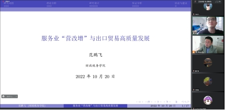 2022年第2期闻道学术论坛在线上举行。本期讲座由青年博士范鹏飞老师做了题为《服务业“营改增”与出口贸易高质量发展》的学术报告。研讨会由青年博士胡春龙老师主持,本院部分青年老师、研究生参加了讲座。