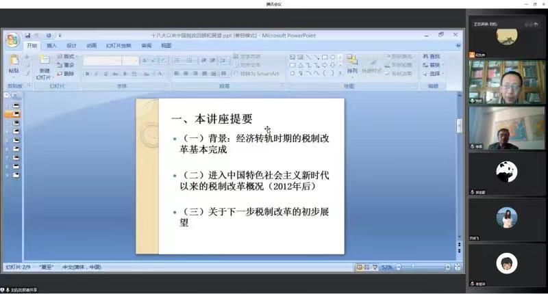2022年第7期财税学术讲座以线上方式举行,国家税务总局税收科学研究所原所长、研究员刘佐做了题为“十八大以来中国税制改革的回顾和展望”的学术报告。财税学院院长李森主持会议,财税学院部分青年教师参加会议。