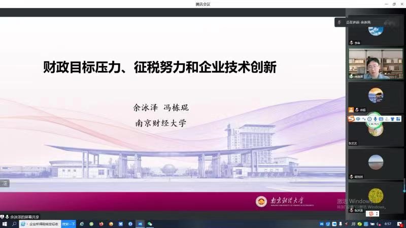 2022年第8期财税学术讲座以线上方式举行,南京财经大学财税学院院长余泳泽做了题为“财政目标压力、征税努力与企业创新”的学术报告。财税学院院长李森主持会议,财税学院部分青年教师参加会议。