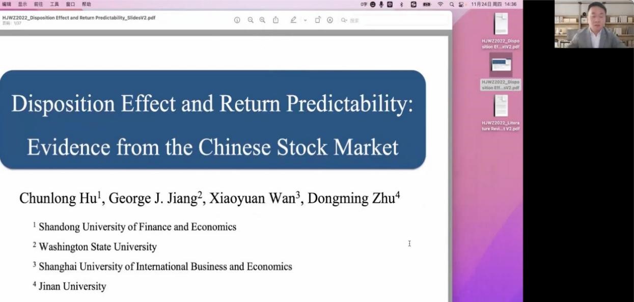 2022年第5期闻道学术论坛在线上举行。青年博士胡春龙报告了与华盛顿州立大学George J. Jiang教授、上海对外经贸大学万孝园教师、暨南大学朱东明教授合作完成的英文工作论文(按姓氏排序):《Disposition Effect and Return Predictability: Evidence from the Chinese Stock Market》,研讨会由青年博士尹鸿飞主持。