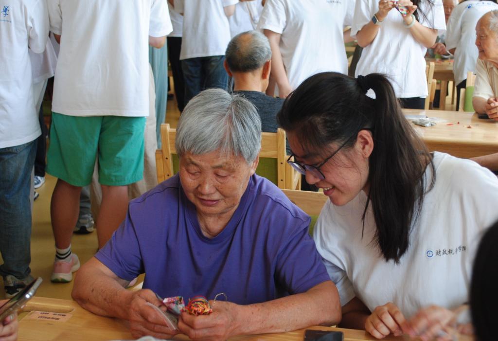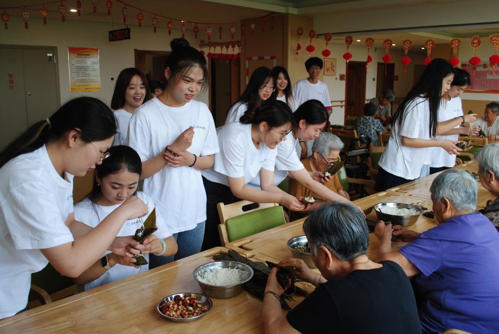 活动伊始,学生志愿者在服务中心工作人员的带领下,参观了老年人的居住环境,了解了老年人的日常生活。活动中,学生志愿者与老人们欢聚一堂,共同体验包粽子和编五彩绳的传统民俗。拿粽叶、做漏斗状、填糯米、压紧实、加馅料、系棕绳,欢乐的笑声和粽子的清香交织在一起;粽香四溢,不仅留香齿间,更沁入人心,温暖了每一位老年人的心田。五彩绳是端午节特有的吉祥饰品,被称为“长命缕”,又名“续命缕”、“避兵缯”、“五色丝”、“长命寿线”等,具有驱妖避邪,祈福安康的美好寓意;彩线轻缠,学生志愿者为老人们系上五彩绳,同时也将幸福美满、健康长寿的美好祝愿系在绳里。