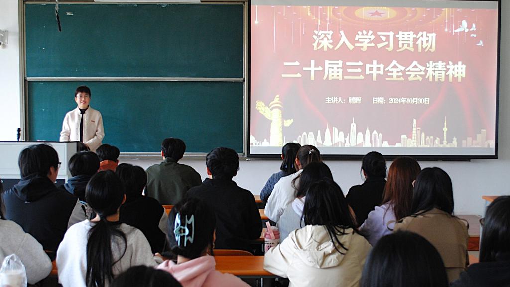 滕晖带领同学们对党的二十届三中全会精神进行深入学习,讲解了全会的召开背景和重要精神,并对全会的“一个总目标”“七个聚焦”和“五个原则”进行重点讲解,带领同学们逐条学习。紧接着,她围绕全会对进一步全面深化改革所做出的部署这一内容,与同学们展开讨论学习。课程最后,滕晖提出几点要求:一要坚定理想信念,深入学习贯彻党的二十届三中全会精神;二要遵守党规党纪,认真履行学生党员的责任与义务;三要彰显青年担当,为学院和学校发展、国家进步贡献自己的青春力量。