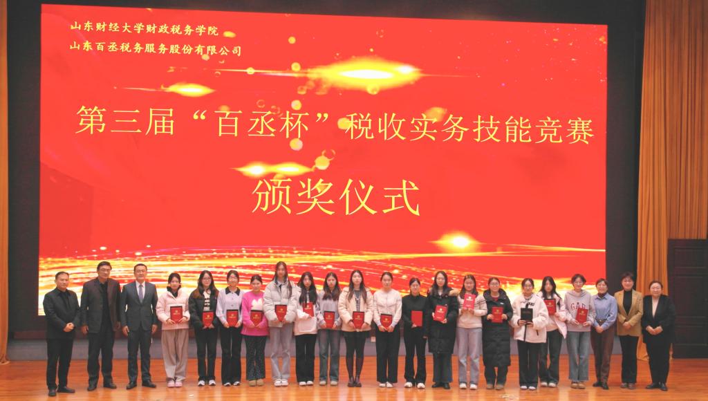 第三届“百丞杯”税收实务技能竞赛于圣井校区图书馆报告厅圆满落下帷幕。山东百丞税务服务股份有限公司总经理董华、合伙人田峥峥,樱桃影视