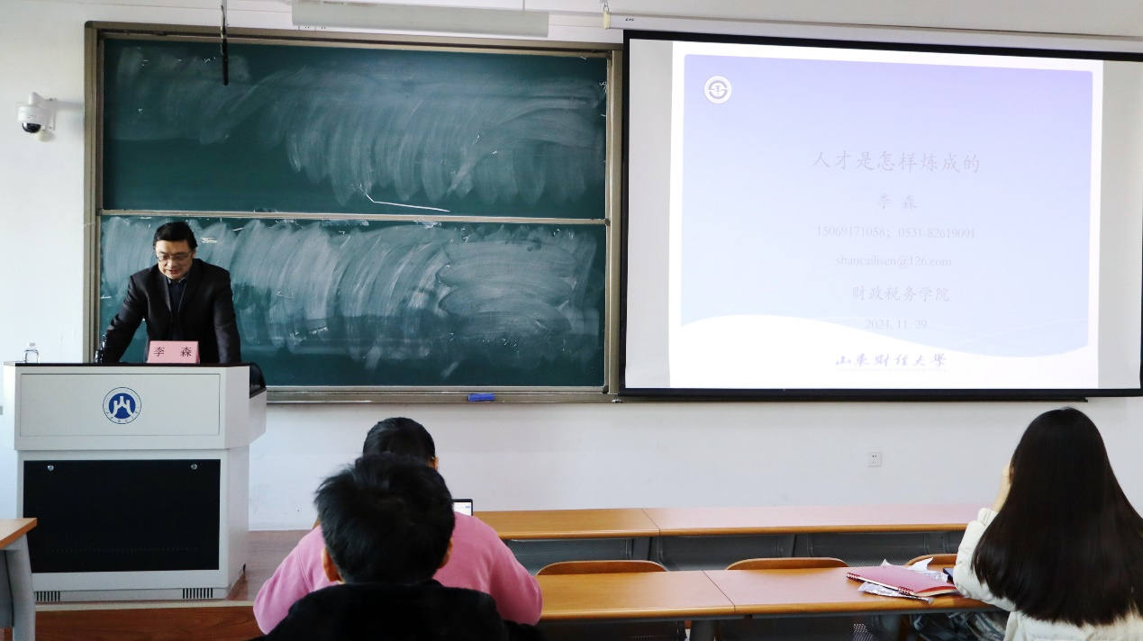此次讲座围绕如何培养德智体美劳全面发展的人才展开,致力于激发学生的自我培养意识,贯彻落实人才培养计划。李森通过分析不同的个人能力获取渠道阐明了人才的概念,并以不同的人才为例,鼓舞同学们找到适合自己的发展目标。李森重点对如何成长为人才展开详细论述,并对财税学子提出以下几点要求:一要树立科学的世界观与方法论,坚持正确价值观的指引,以哲学的观点认识财税专业、学习专业知识;二要充分运用比较优势原理,降低自己成为人才的成本,主动发掘自己的比较优势增强学习信心;三要认识学习的重要性,以学习为学生的第一要务,转被动学习为主动学习;四要明确自我发展方向,制定切实可行的发展规划,持之以恒实现人生理想;五要加强自身修养,不断提高文化知识水平,营造良好的人际关系。