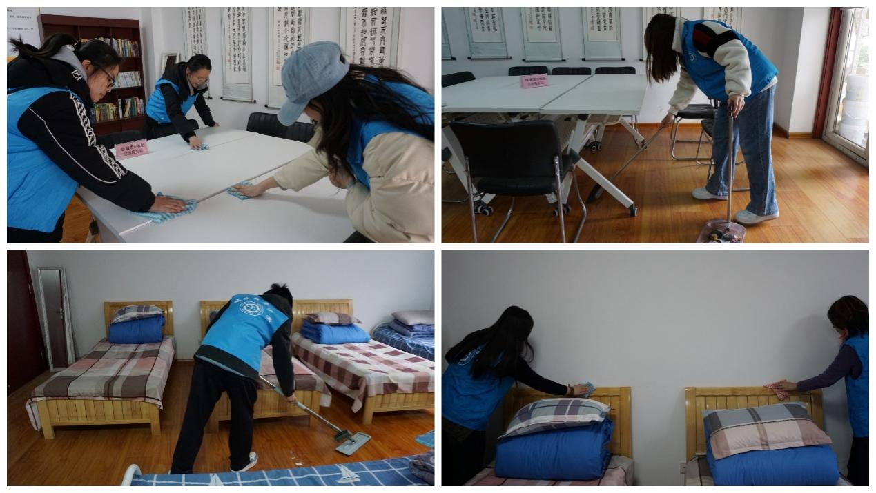 到达后社区后,志愿者们在社区工作人员引导下快速分工,分别负责社区阅览室和日间照料中心的工作。在阅览室,志愿者清扫地面、擦拭书架书桌,并将书籍分拣归类;在日间照料中心,他们整理床铺、收拾卫生,为社区独居的老年人提供了一个舒适、整洁的休憩环境。