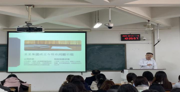 韩毅围绕A市税务局与某某集团的税务纠纷案例展开报告,其内容主要有以下四个方面。一是税务纠纷概况:A市税务局对某某集团的三次税务检查情况及涉税风险;二是分析案情,找准问题:税收检查工作中存在的问题;三是重新核查,明确结果:核查小组分工复查账簿资料,详查预收款、调查疑点,解决多项争议;四是总结经验,改进工作:税务检查工作需要深入调查、规范取证、研究政策、积极化解矛盾等。最后,赵宝廷对讲座进行了点评,对韩毅细致而又专业的案例分析表示感谢,鼓励同学们以本次讲座为契机,将理论知识与社会实践结合起来,努力成长为新时代财税领域的高端应用型人才。