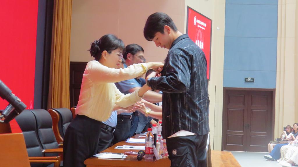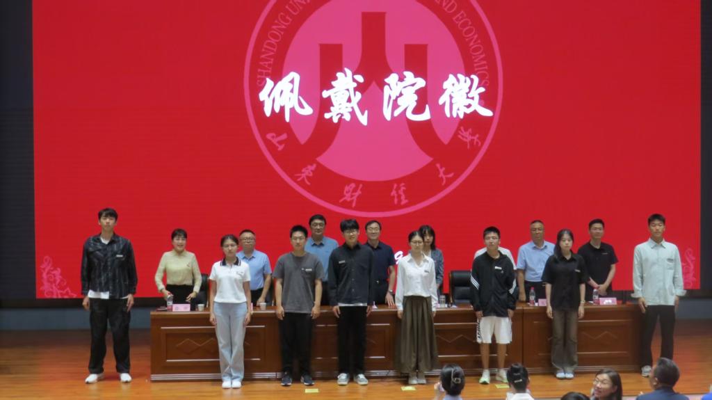 在全场师生的见证下,领导老师们为新生代表佩戴定制院徽。方寸院徽,承载着学院对新同学们的深厚期许与满满祝福。
