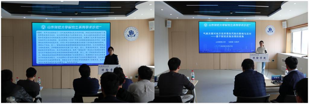论文汇报与点评环节,财政税务学院博士研究生任海平汇报了题为《气候灾害对地方政府债务风险的影响与应对——基于财政应急治理的视角》的工作论文,硕士研究生魏雨丹汇报了题为《走向对称:留抵退税如何影响税负粘性》的工作论文。与会专家从论文选题、故事逻辑、研究设计和实证方法等多个维度进行了点评,并与在场师生互动交流。