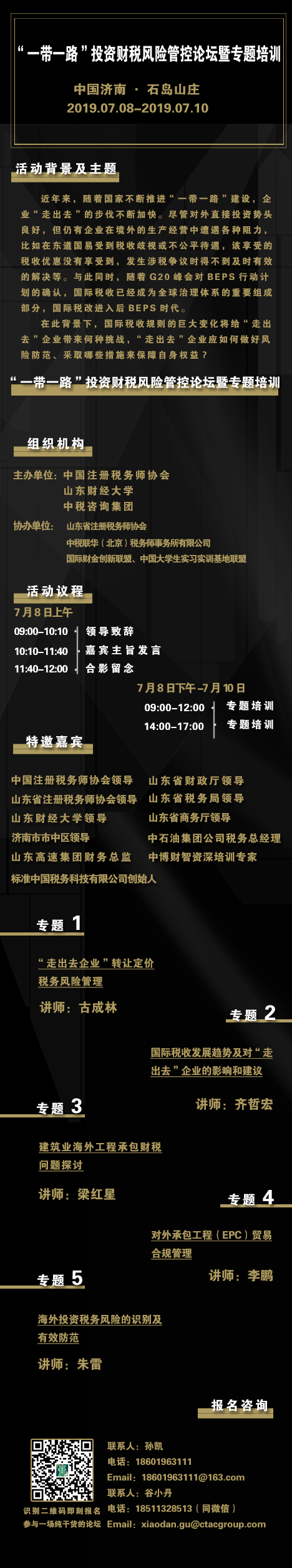 中国注册税务师协会携手樱桃影视 、中税咨询集团于7月8-10日在济南举办“一带一路投资财税风险管控论坛暨专题培训”。
