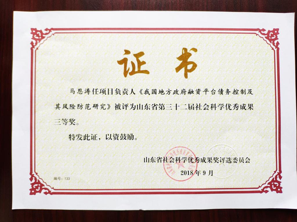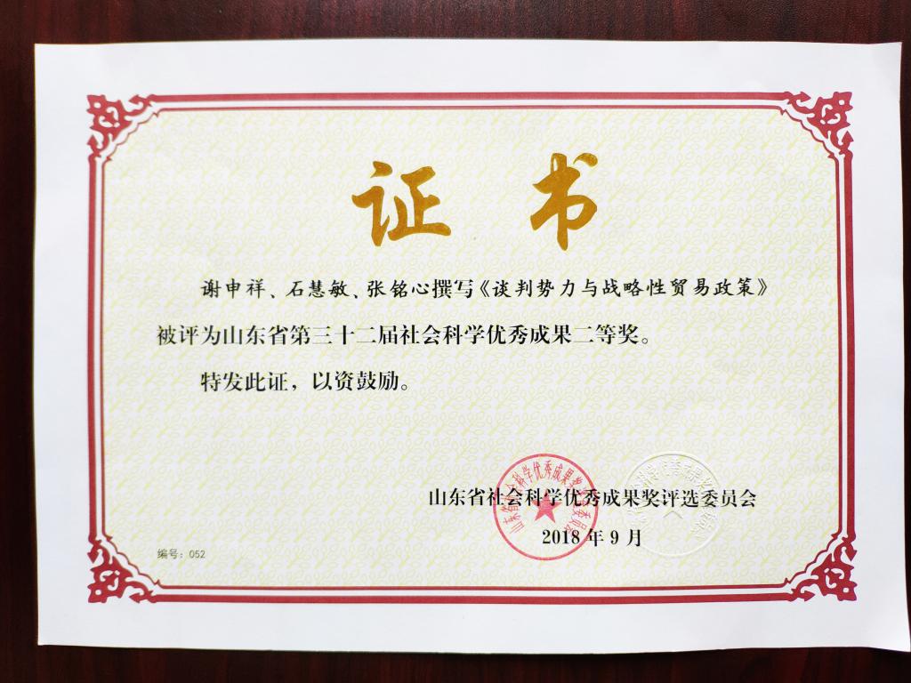 谢申祥教授申报的论文《谈判势力与战略性贸易政策》和马恩涛教授申报的研究报告《我国地方政府融资平台债务控制及其风险防范研究》分获二等奖和三等奖。