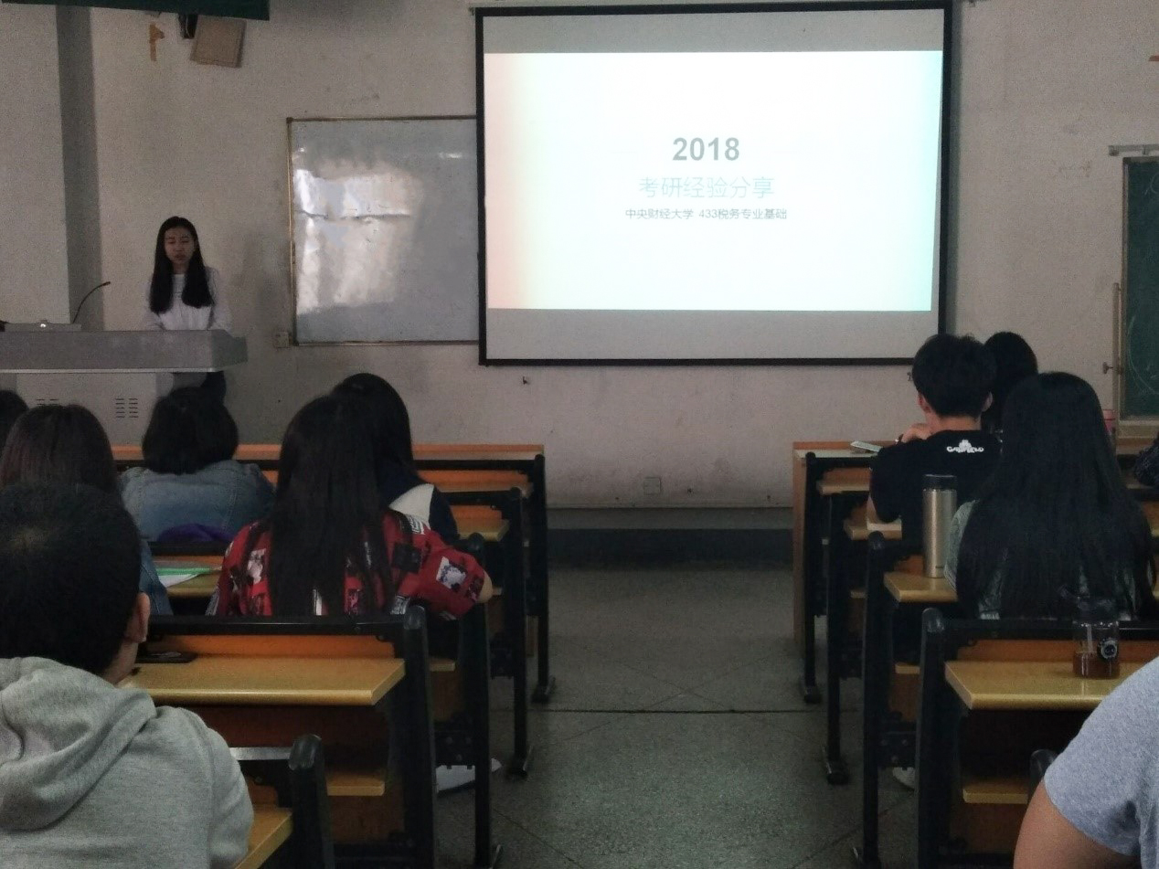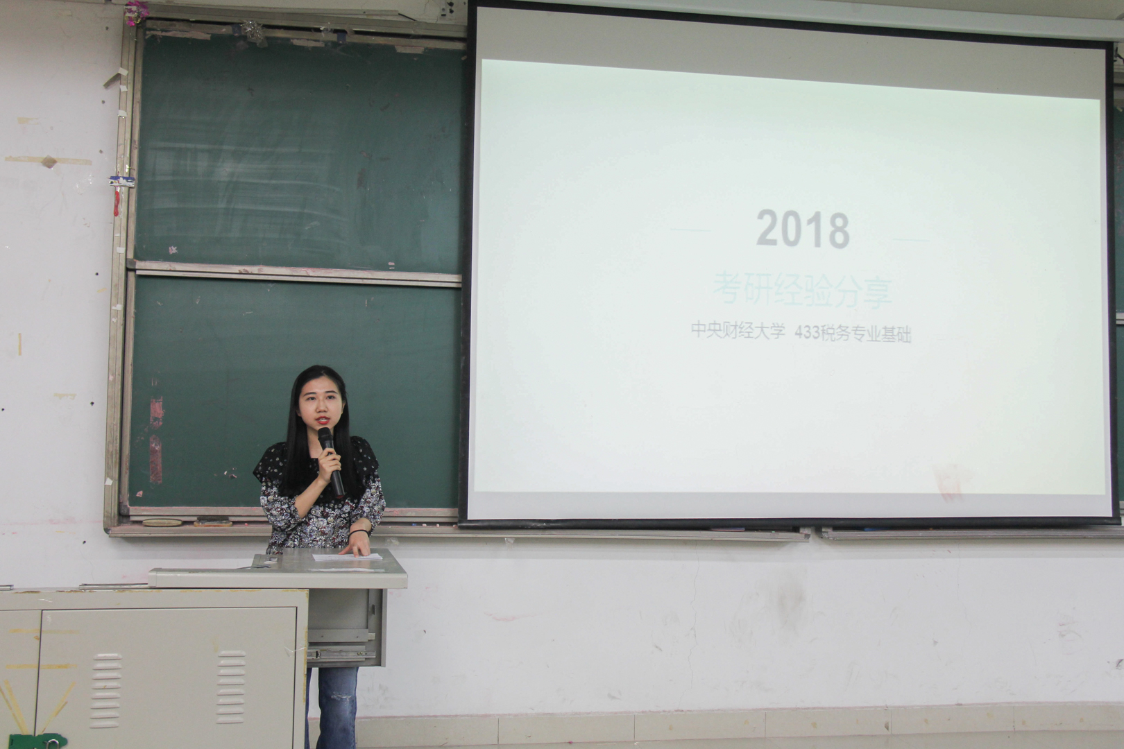 随后,在2018年研究生入学考试中取得优异成绩的同学为大家分享考研经验。考入中央财经大学的张晓旭给同学们分享了自己的考研计划并指出制定适合自己的考研计划是考研过程中很重要的一个环节,而长久不懈的坚持则是成功的唯一道路。考入上海财经大学的张晓旭为大家在考研初期所面对的疑惑做出了解答,她强调要重视初、中期的复习,但更不能放弃最后关头的努力,保持一颗平常心,学会适度放松和自我调节。