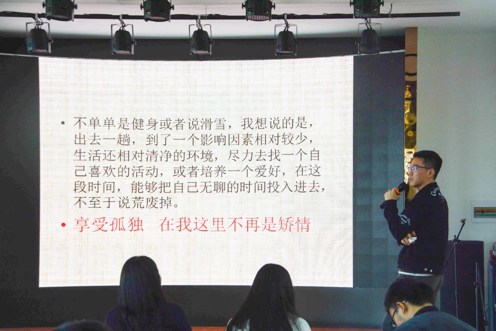 接着,在波兰罗兹大学留学的徐睿、刘泽法上台发言。徐睿借自身经历,讲述了国外和国内生活的不同。波兰的老师们不仅传授专业知识,还教给同学们为人处世的方法、在国外生存的技能。同时,徐睿认为国外学习强度大、更强调自主性,同学们要学会自律。刘泽法从在异地的感受、波兰生活和旅行生活三个方面介绍了他的留学生活。他用一张张迷人的风景照向同学们展示了他在华沙生活的点点滴滴,分享了他在捷克、奥地利、法国、希腊等地旅行的经历。同学们了解了异国的文化魅力和罗兹大学的课堂活力,对留学生活充满了期待。