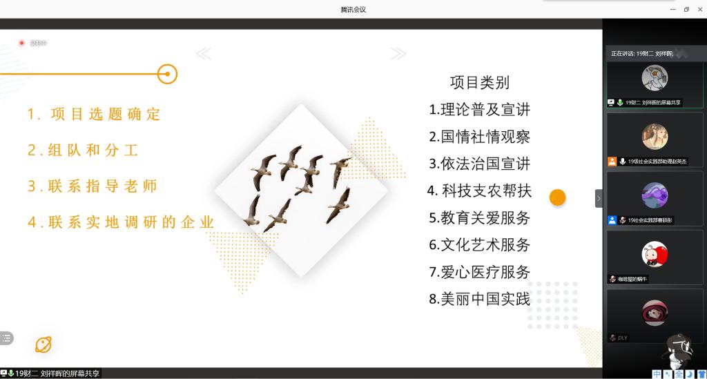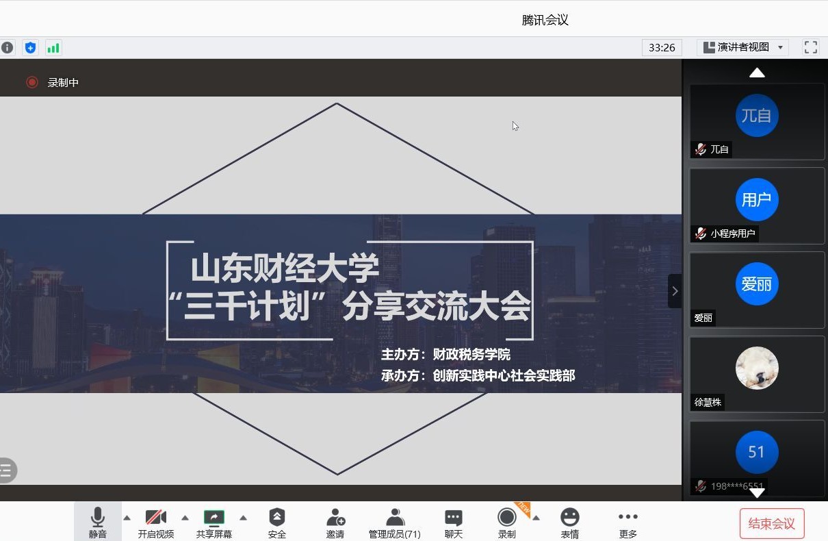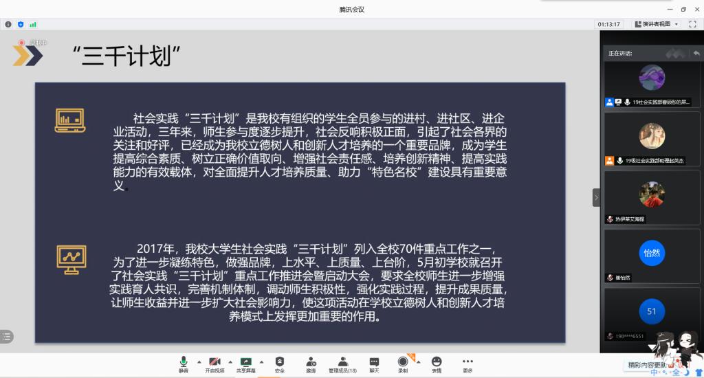 主办,院学生会创新实践中心社会实践部承办。会议以线上形式进行,旨在为大一新生构建认知“三千计划”等社会实践项目的桥梁,并邀请了本年度“三千计划”项目的优秀团队代表进行经验交流分享。2019级“三千计划”优秀团队队长受邀出席了本次活动,2020级部分同学参加了本次活动。