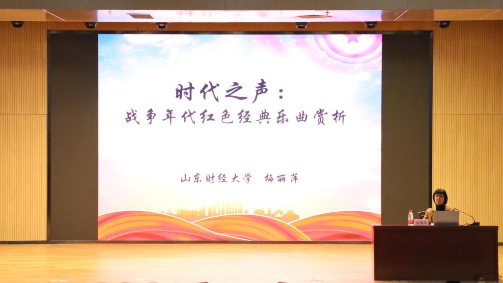 在讲座中,梅丽萍老师指出,这次活动的主题是通过欣赏音乐来回顾、重温我们的革命历史。她引用冼星海的名言:“音乐,是陶冶性情的熔炉”,清晰直观地向同学们阐明自己对音乐的理解。同时,她与同学们共同欣赏并解析了抗日战争、解放战争、抗美援朝三个时期的几个经典音乐作品。