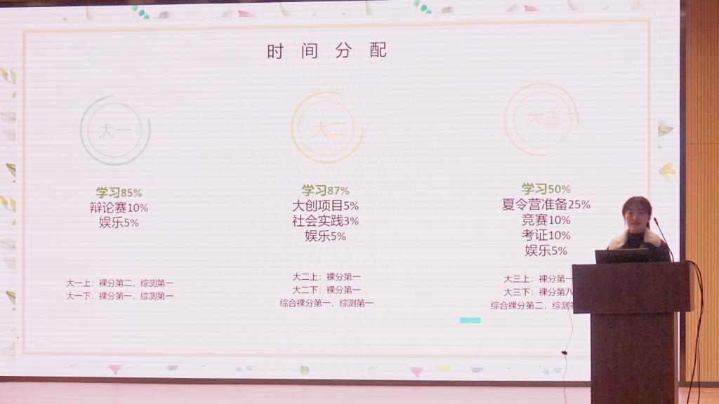 在介绍竞赛项目的同时,王正琪解释道,虽说这些竞赛可以相互转化,但同时也要注意到它们的侧重点是不同的:“挑战杯”注重的是一个方案的实践性和项目报告的文本撰写能力,而“互联网+”更看重项目最终得到的科技成果与PPT介绍能力。“你若盛开,蝴蝶自来”,只要脚踏实地,努力提升自己的核心竞争力,我们终会成为一颗闪耀的星星。