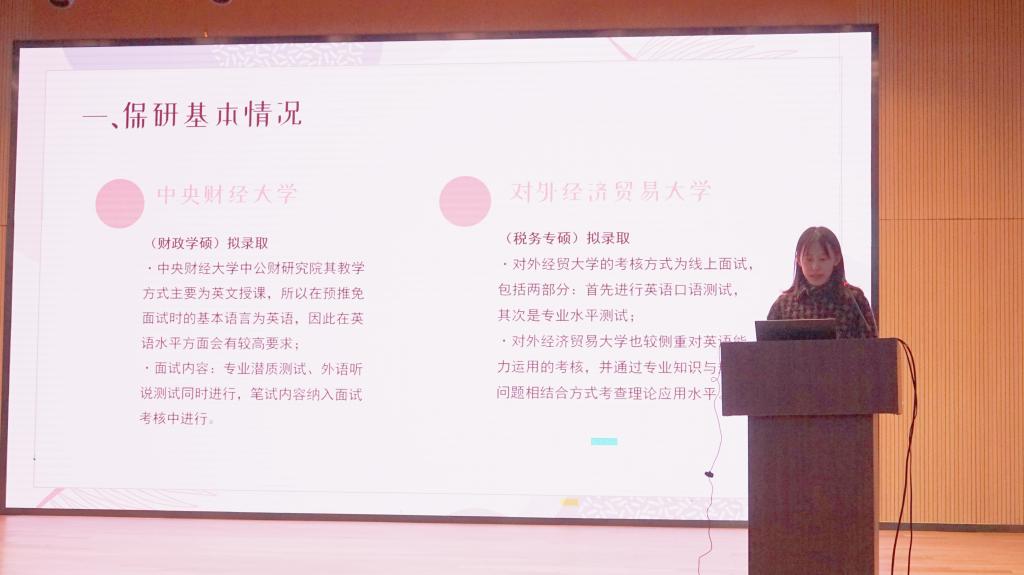 王正琪告诉大家,推免资格不仅要靠卓越的学业成绩,也需要与较高的思想行为成绩和专业创新成绩相结合,两者成绩越高,获得推免机会的几率就越大,而提高这两者的一个有效途径就是参加科研竞赛,在此她向大家详细介绍了“挑战杯”和“互联网+”两种竞赛项目。“挑战杯”一共分成三个参赛类别,我校历年的参赛重点是“哲学社会科学类学术论文与调查报告”;“互联网+”是全国最大的路演平台,我校的参赛重点是“高校赛道”与“红旅赛道”。王正琪强调,我校学生在此类竞赛面前是有一定优势的,由于这些竞赛都注重项目本身的实践性,而山财每年暑期举办的“三千计划”就是一项大型的社会实践调研活动,我校的大多竞赛项目都是由“三千计划”转化来的。