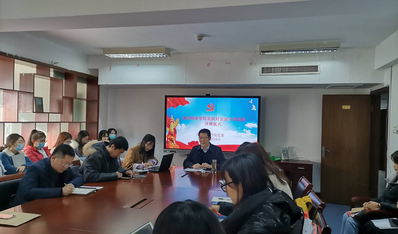 党员发展对象集中培训班开班仪式在舜耕校区办公楼816会议室顺利举行。学院党委书记李玉成出席开班仪式并发表讲话。学院团委书记、研究生辅导员王正一,2017级税收学辅导员李建永,2017级财政学辅导员郭滨滨和本期全体党员发展对象参加开班仪式。开班仪式由学院专职组织员李子云主持。