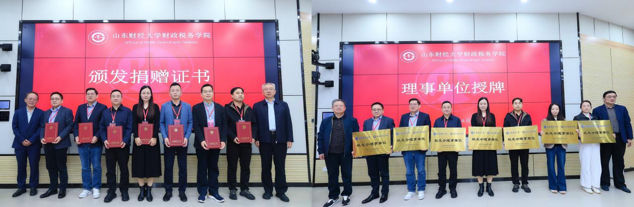 张新为捐赠校友代表颁发捐赠证书。学院负责人为7家校友企业授予分会理事单位牌匾。