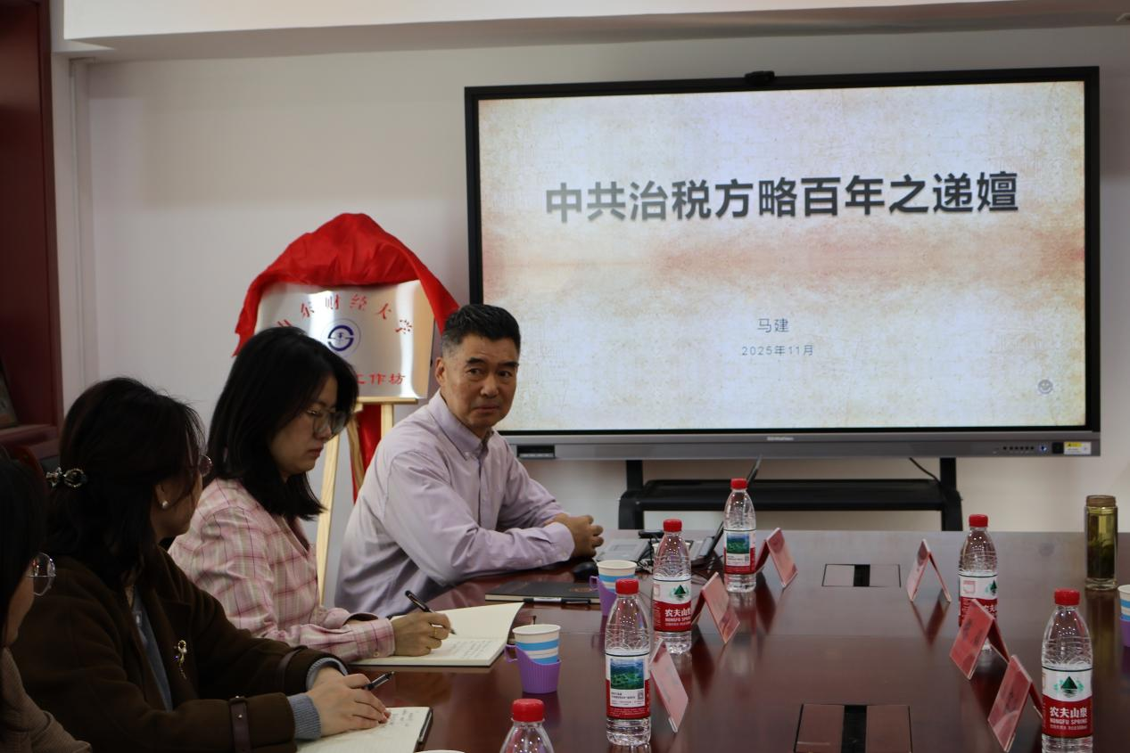 13日上午,在专题讲座部分,济南税务局研究所原所长马建研究员做了题为《中国共产党治税方略百年之递嬗》的讲座。马建系统梳理了无产阶级政党与税收的关系、百年治税历程及其时代启示。他系统介绍了中国税制从初创到成熟、从保障革命到赋能治理的历史性跨越,充分体现了党的坚强领导对税收事业发展的根本保障作用,展现了中国特色社会主义财税体制的优越性。王敏高度肯定了讲座的学术价值与育人意义,强调应进一步加强跨专业合作,推动红色财税精神融入学科建设与课程体系。武普照结合自身数十载的教学经验,分享了关于中国赋税史与中国共产党百年治税史的传承与发展关系。